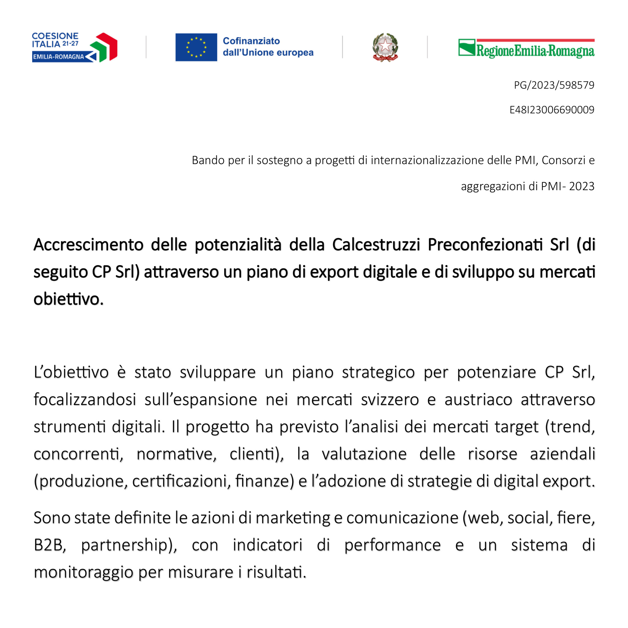 Accrescimento delle potenzialità della Calcestruzzi Preconfezionati Srl (di seguito CP Srl) attraverso un piano di export digitale e di sviluppo su mercati obiettivo.